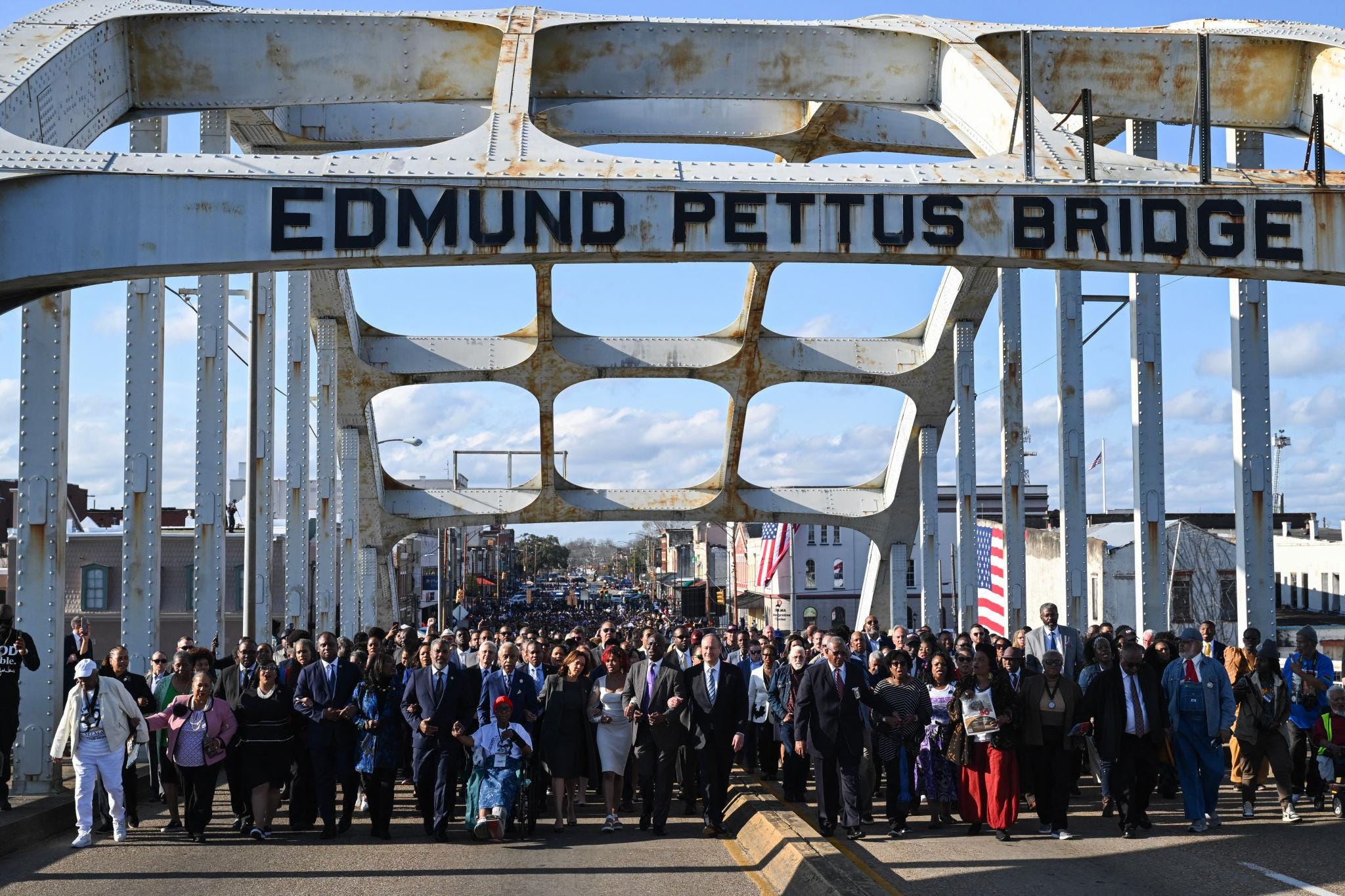 We walk across the Edmund Pettus Bridge in Selma.