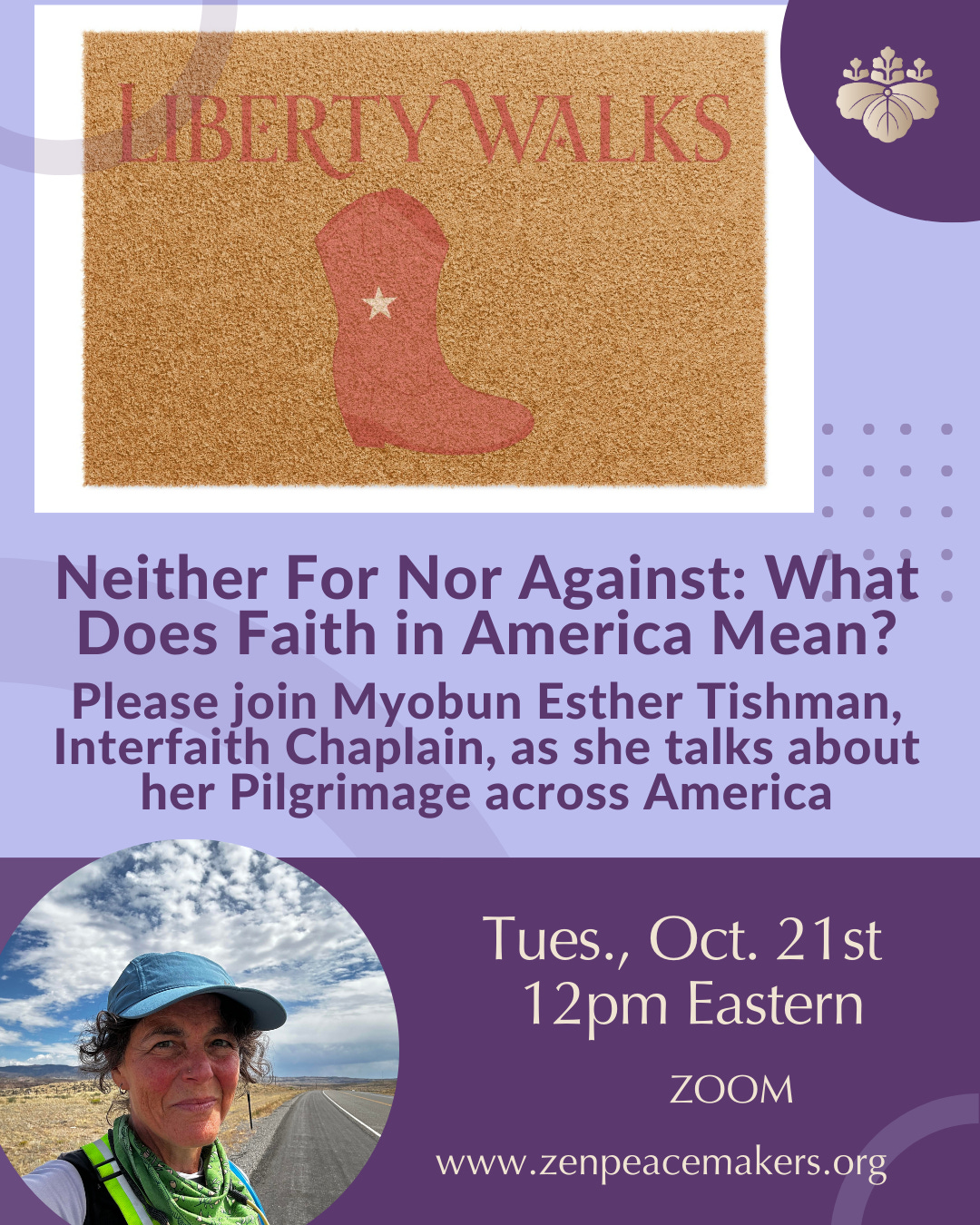 Myobun Esther Tishman, ordained Zen teacher and interfaith chaplain, is walking across this country, from Oregon to Washington, DC, in response to the fear, chaos, and doubts that have overtaken many Americans. Myobun will share stories and learnings from the past 2100 miles, and from her 21 years in the dharma.